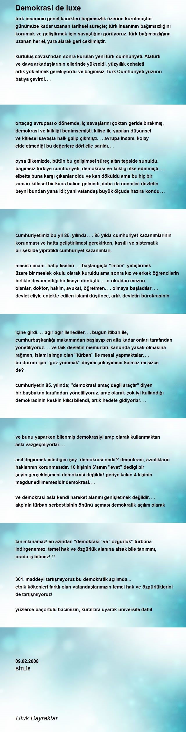 oysa ülkemizde, bütün bu gelişimsel süreç altın tepside sunuldu. bağımsız türkiye cumhuriyeti, demokrasi ve laikliği ilke edinmişti... elbette buna karşı çıkanlar oldu ve kan döküldü ama bu hiç bir zaman kitlesel bir kaos haline gelmedi, daha da önemlisi devletin beyni bundan yana idi; yani vatandaş büyük ölçüde hazıra kondu...